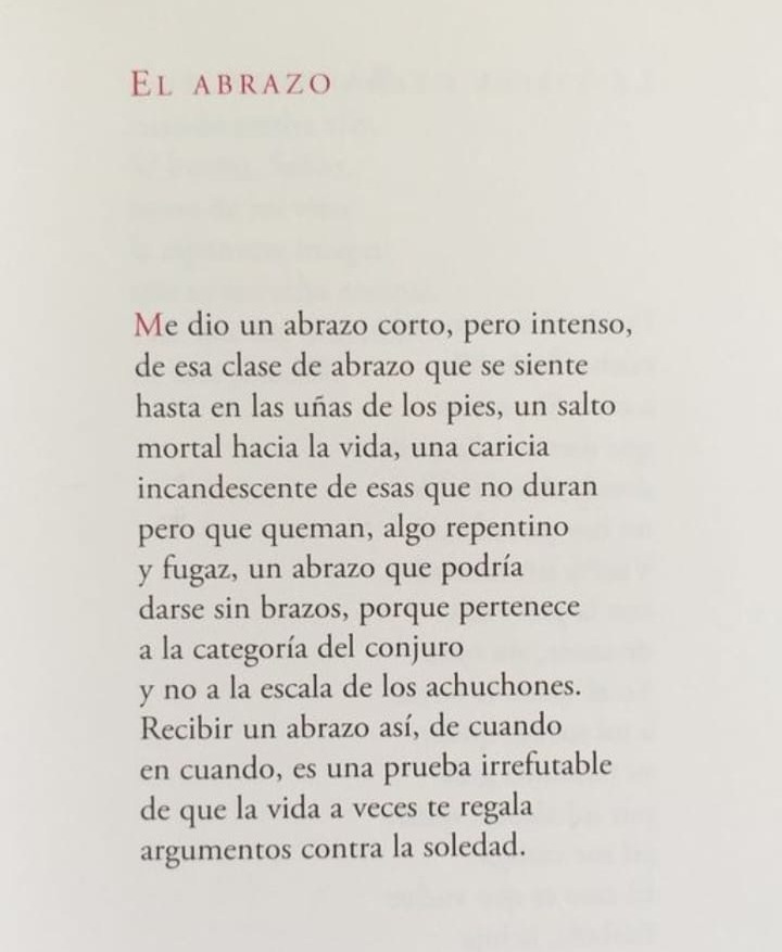 Un post en una imagen. El abrazo. Me lo compartió una amiga experta en el tema. De un tiempo a esta parte he pensado que un gesto aparentemente simple es la manera más enfática de expresar la proximidad emocional con el de enfrente. Es una manera de transmitir al otro que no está solo. El abrazo es como una columna de carne ante la intemperie. Abrazar a alguien es un acto de confianza, pero también de indigencia, porque de alguna manera abres los brazos y muestras el corazón… y así nos volvemos vulnerables.